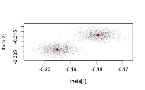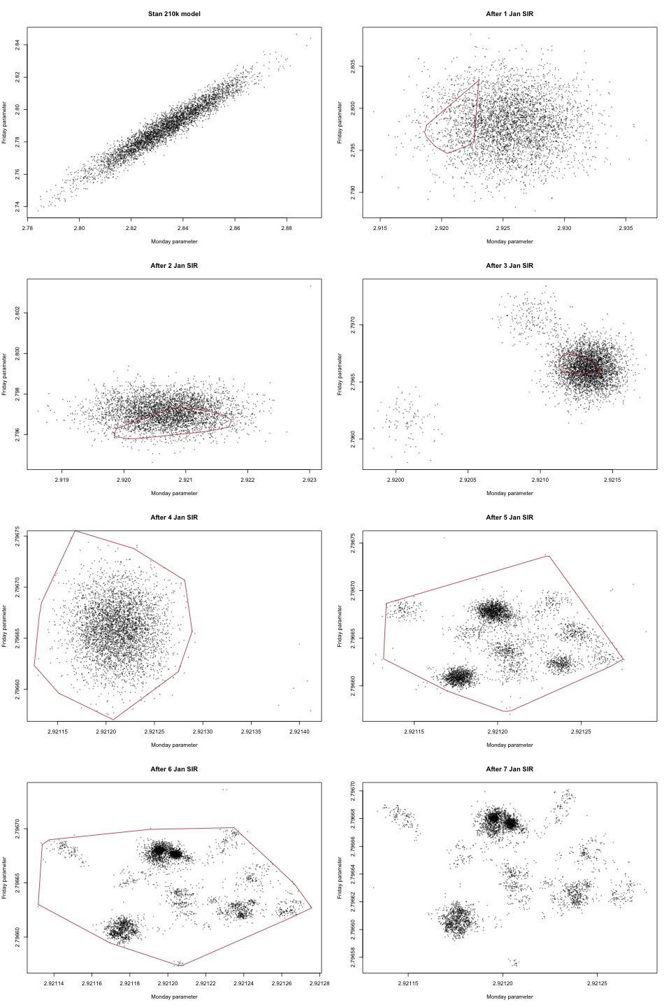 The SIR-A analysis (including data prep) is in this R script (there is no Stan involved for SIR). The output is all in one .rds file. The issue of degeneracy is illustrated by this scatterplot of proposed parameter values from SIR-A, looking at two parameters. The red dots are prior draws and we can see that SIR-A is just samping around them according to the kernel. The kernels overlap marginally but not jointly. Another example is in this set of scatterplots looking at the parameters for Monday and Friday over successive updates. The red polygons are convex hulls of the next p[oste]rior. In this case, degeneracy is not obvious (multimodal) until the likelihood curvature has become comparable to the prior curvature, after a few days.