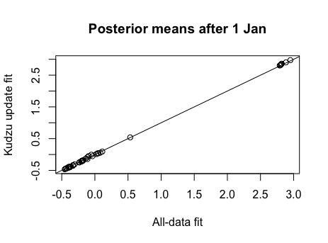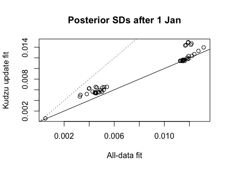The posterior means after 1 Jan are compared to the prior means here (and they look almost identical), while the SDs are compared here (and they look inflated; the dotted line is double inflation). Succcessive updates don't get much worse, and the inflation is not monotonic over updates, so it may be the early updates that are problematic. Marginal variance inflation is one of the outstanding challenges in appying kudzu effectively. There is much scope for experimentation with adaptive approaches to bandwidth specification and delta-translation.