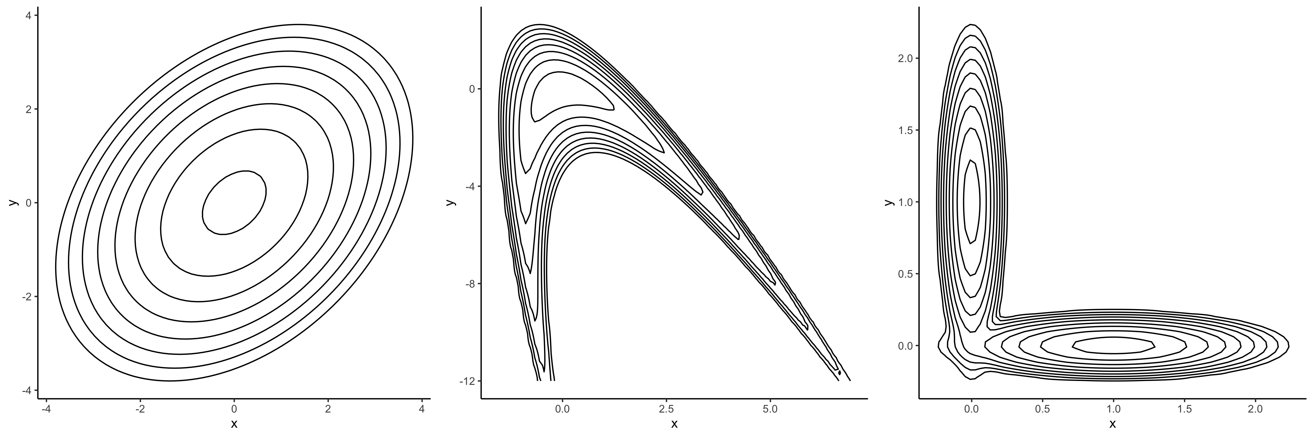 Secondly, we must apply a small gradient outside the prior sample bounding box (smallest hypercuboid containing all prior draws), in order to guide the sampler back to the region of highest density. I do this by mixing 0.98 times the kudzu density with 0.02 times a multivariate normal density, centred on the approximate mode and with standard deviation twice that of the largest principal component standard deviation.