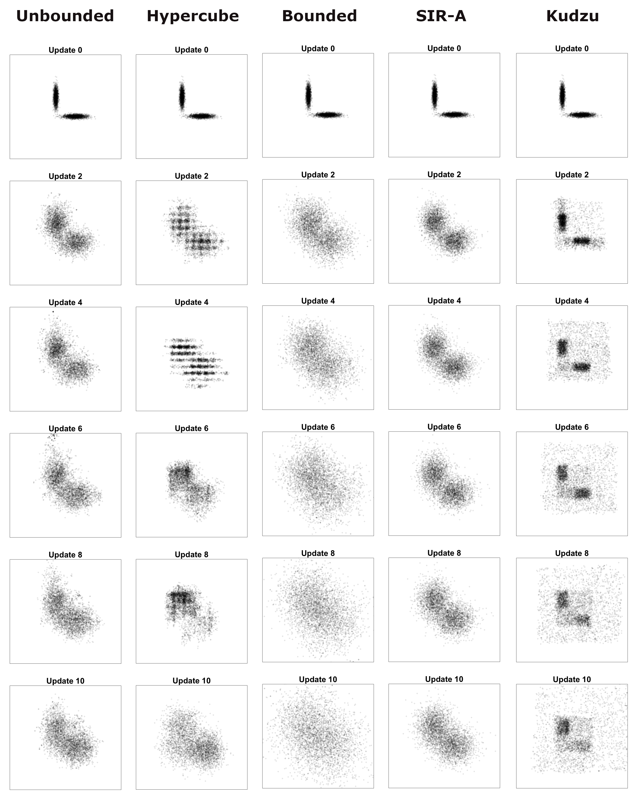 Some of the most interesting output is in these scatterplots of successive posteriors, as we keep updating repeatedly, for every combination of method and distribution (only one of these made it into the paper).